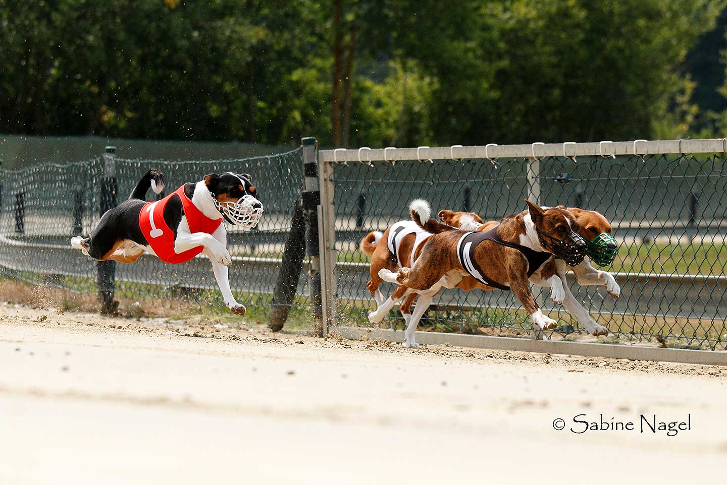 - Es ist zu empfehlen, den jungen Basenji am Anfang nur alleine laufen zu lassen, damit er genügen „Hasenschärfe“ entwickelt und nicht anfängt, auf der Bahn mit anderen mitlaufenden Basenjis zu spielen!
